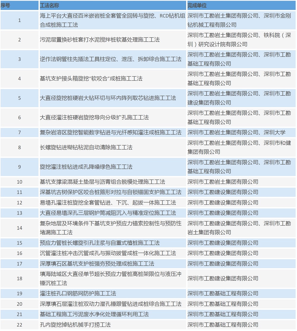 工勘集團(tuán)作為巖土工程這一傳統(tǒng)行業(yè)內(nèi)的深耕者,始終堅(jiān)守專業(yè)主義和長期主義,持續(xù)以工法為抓手,聚焦工程項(xiàng)目中的關(guān)鍵技術(shù)難點(diǎn)和質(zhì)量通病,積極開展新工藝方法研究、新技術(shù)施工應(yīng)用及專利研發(fā)申報(bào)等科技創(chuàng)新工作,努力形成具備更多推廣應(yīng)用價(jià)值高、實(shí)用性強(qiáng)的關(guān)鍵技術(shù)。目前,工勘集團(tuán)已獲評141項(xiàng)市級工法和103項(xiàng)省級工法,成為行業(yè)內(nèi)擁有最多施工工法的企業(yè),奮力躋身于廣東省巖土行業(yè)的前列,為解決實(shí)際工程技術(shù)難題、提升行業(yè)施工水平貢獻(xiàn)工勘智慧與力量。